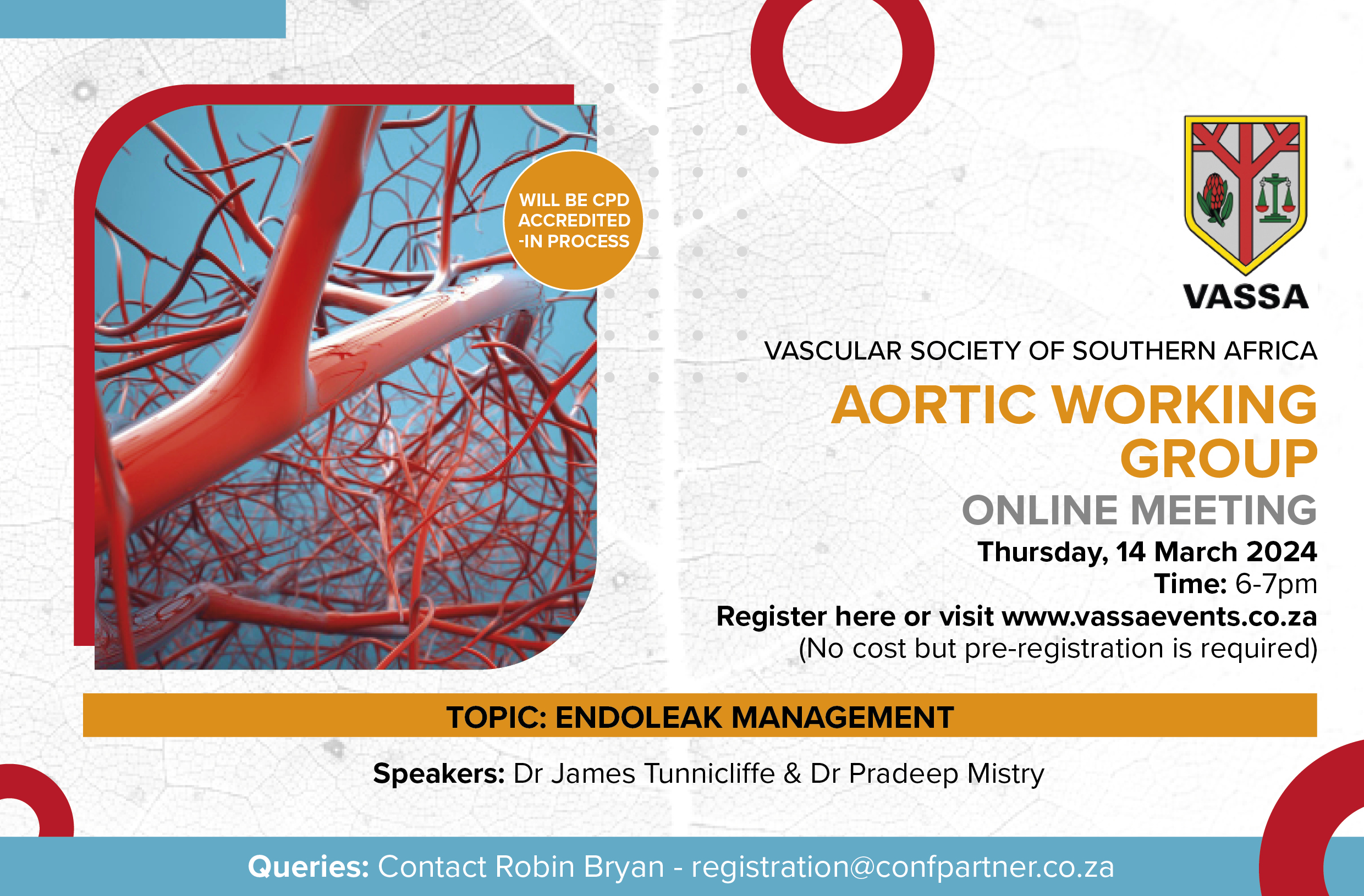You are invited to join a VASSA Aortic Group Meeting on 14th March 2024 from 6pm on the topic of Endoleak Management. Speakers at the meeting will be Dr James Tunnicliffe and Dr Pradeep Mistry.